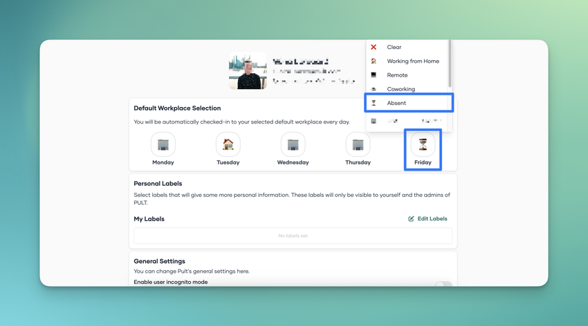 Users can now set “Absent” as a default option for specific weekdays in their personal settings.