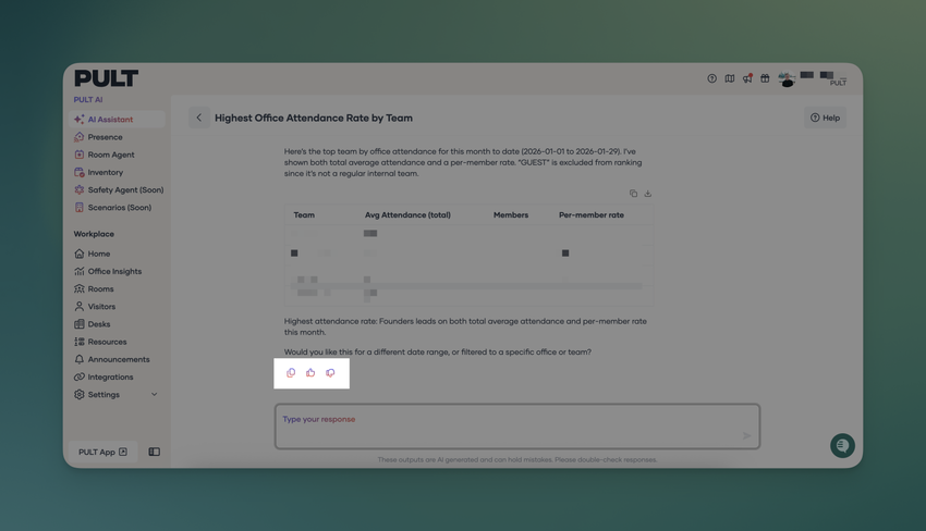 The PULT AI Assistant has been expanded to support meeting room data. You can now ask questions and get information about meeting room bookings, along with access to related insights and statistics. This update makes it easier to understand room usage, review booking activity, and surface key trends—all directly through the AI Assistant.
