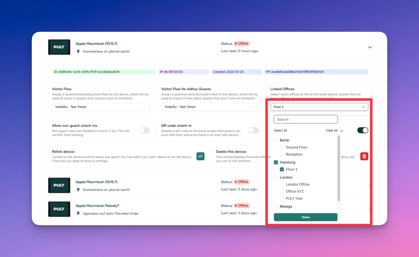 You can now assign a kiosk to multiple office locations at once, so a single check-in iPad can serve visitors across different groups or floors within the same building.