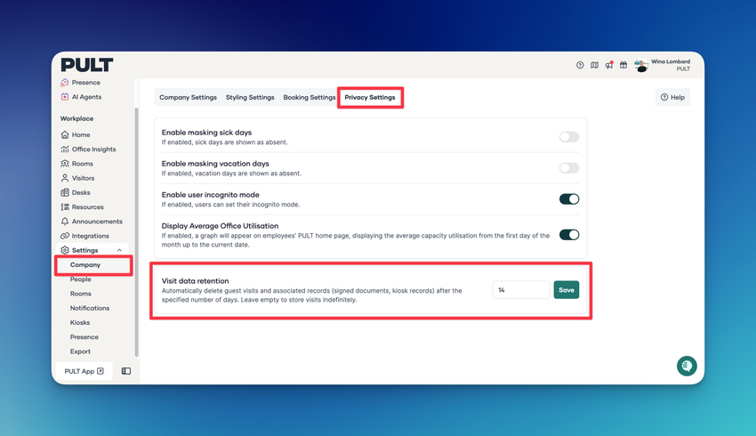 Admins can now configure how long visit data is retained under Privacy Settings in the dashboard. Set a retention period in days, after which visits — along with their associated kiosk records and signed documents — are automatically deleted. Leave it unset to keep data indefinitely.