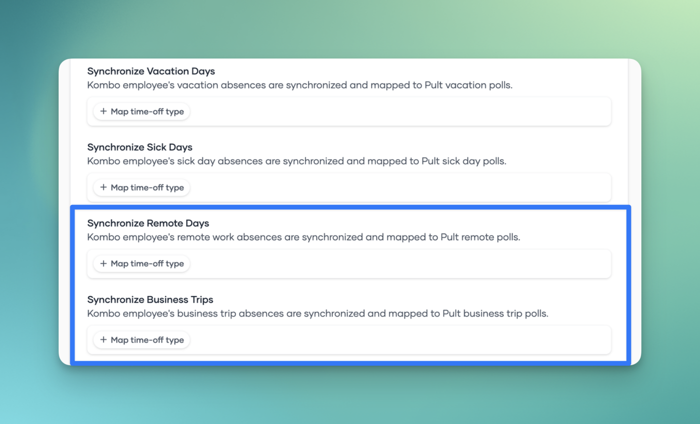 - Absence types can now sync as Remote or Business Trip in addition to the existing Vacation and Sick Day categories.