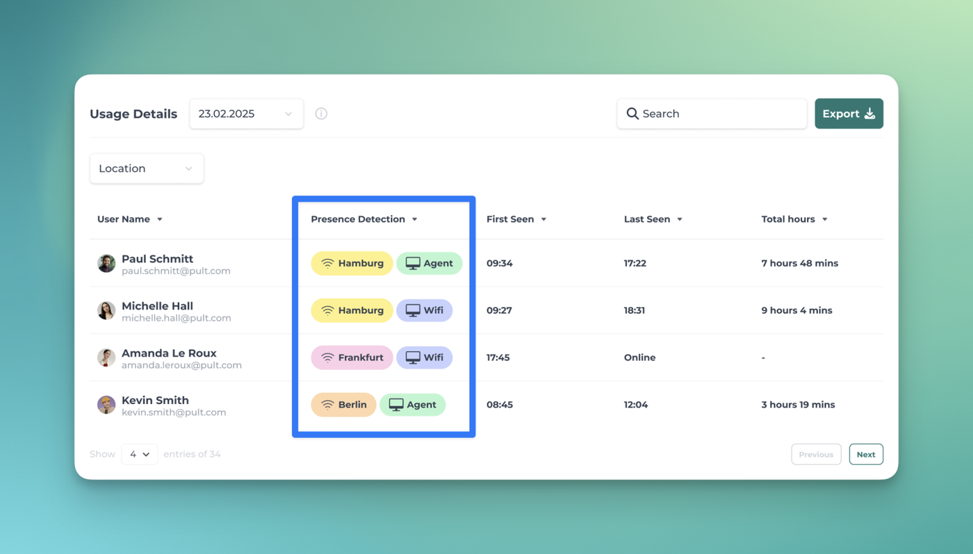 Users can now immediately see whether Presence information is being sourced from the installed PULT Agent or from Wi-Fi–based detection.