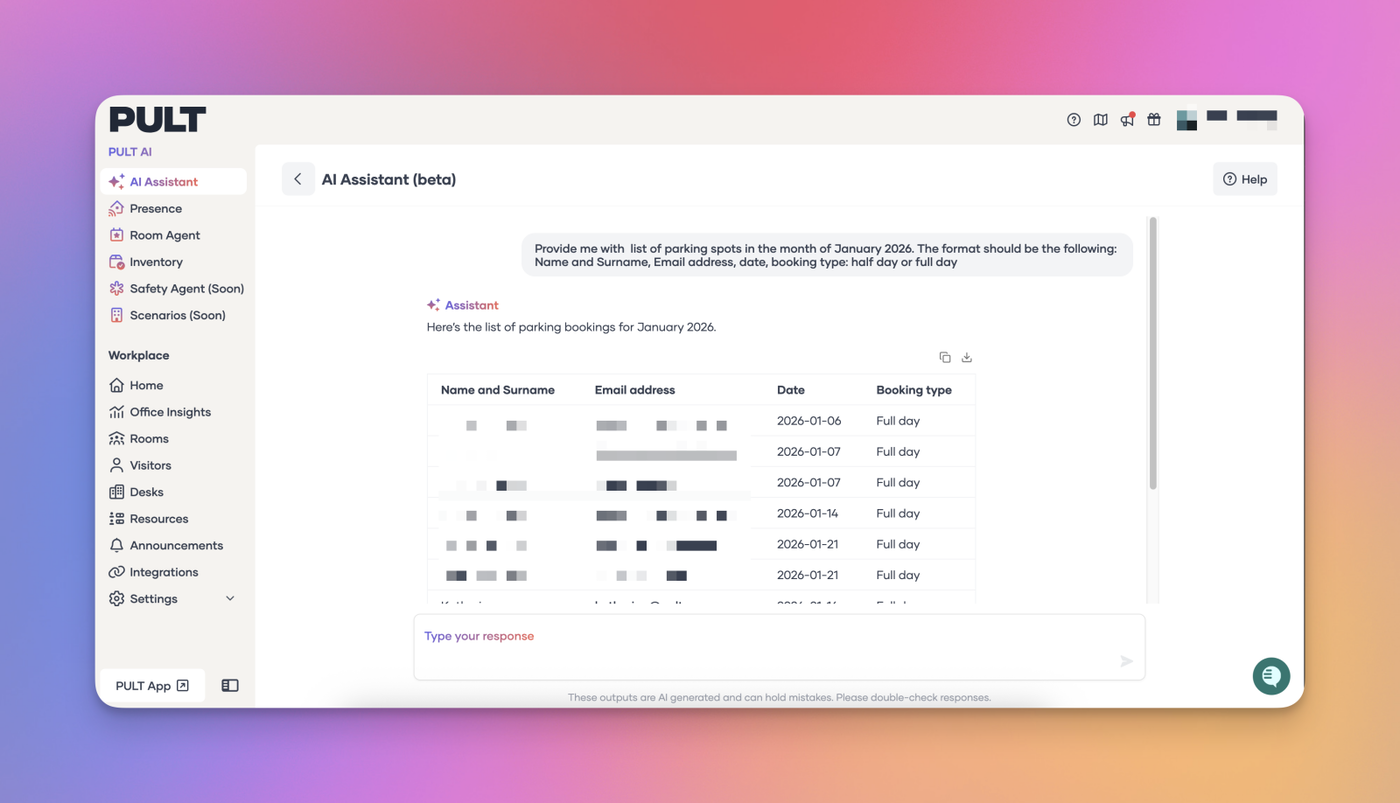 The PULT AI Assistant has been expanded to support meeting room data. You can now ask questions and get information about meeting room bookings, along with access to related insights and statistics. This update makes it easier to understand room usage, review booking activity, and surface key trends—all directly through the AI Assistant.