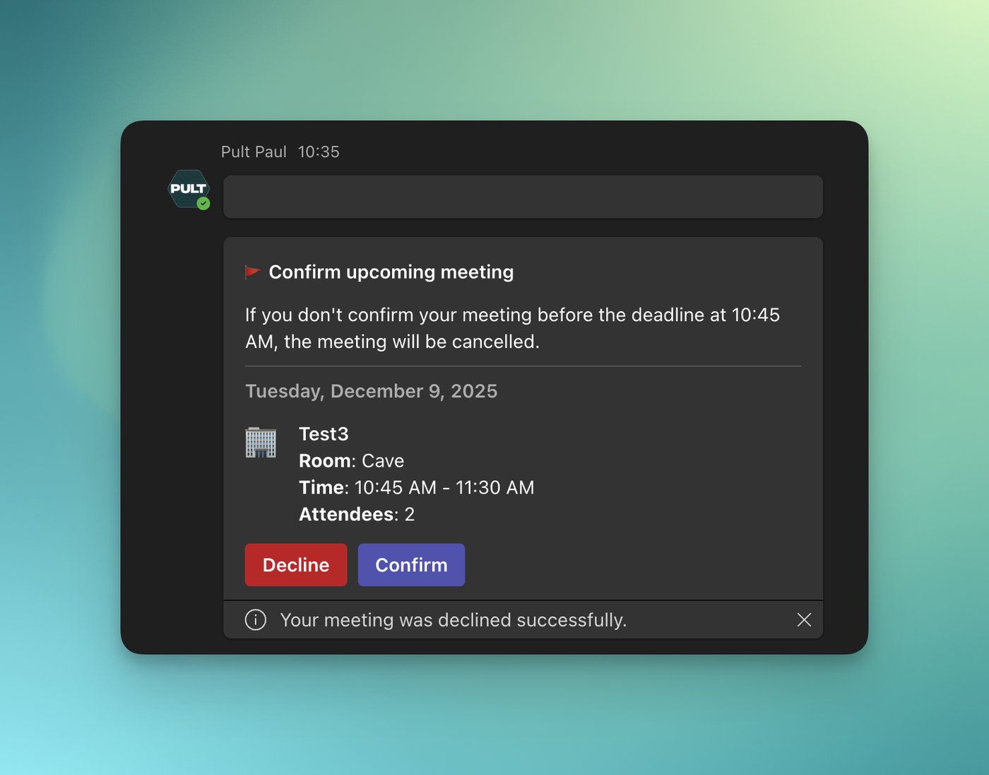 Restrictions for this feature can be configured in the Meeting Room Confirmation Settings. Full setup details are available in the PULT Help Center. We’d love to hear your feedback on this new feature!
